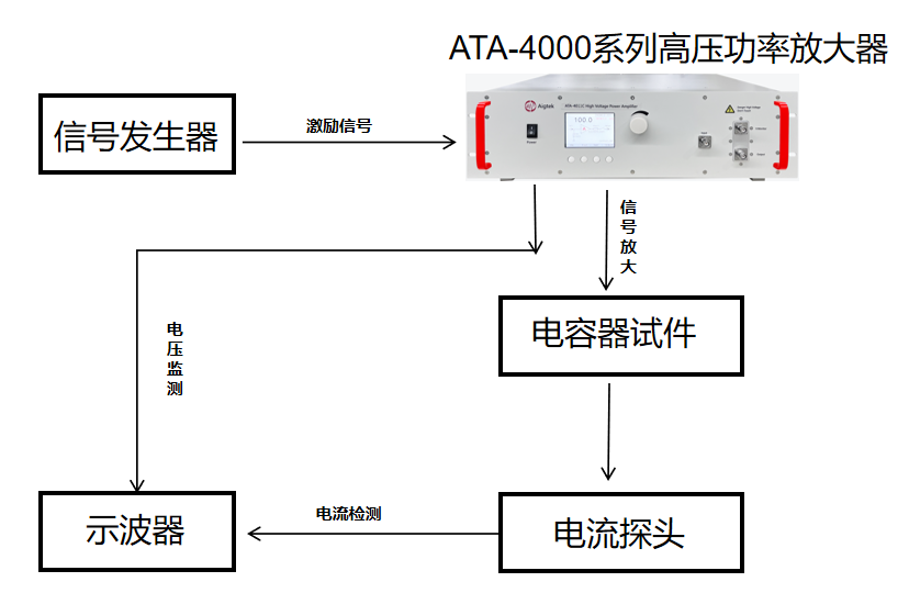 信号发生器产生激励信号经过功率放大器放大输出至电容器两端,用BNC线缆连接功率放大器监测口至示波器监测电压,电流探头监测回路中的电流,由于不同频率的交流电压信号对电容器的ESR值有不同的影响,改变激励信号的频率,观察不同频率下电容器的电压和电流变化。