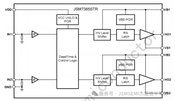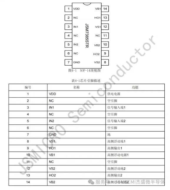 JSM7385S是一款高压、高速功率 MOSFET和IGBT驱动芯片。JSM7385S集成了两路独立的高侧驱动电路,逻辑输入电平兼容低至 3.3V的CMOS或LSTTL逻辑输出电平。JSM7385S其浮动通道可用于驱动高压侧N沟道功率MOSFET,浮地通道最高工作电压可达700V。JSM7385S采用 SOP-14封装,可以在-40℃至125℃温度范围内工作。