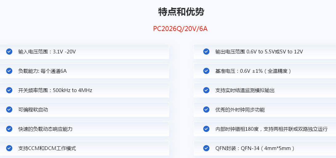 PC2026是一款高效双通道单片同步降压调节器,采用受控导通时间电流模式架构,具有可锁相的开关频率。工作电源电压范围为3.3V至20V,适用于锂离子电池堆叠以及从12V或5V输入的负载点电源应用。工作频率可通过外部电阻编程,范围为500kHz至4MHz,并可与外部时钟信号同步。高频能力允许使用小型表面贴装电感和电容。独特的恒定频率/受控导通时间架构非常适合高降压比应用,在高频下运行并要求快速瞬态响应。PC2026可以选择强制连续模式和高效突发模式操作。PC2026和PC2026A在输出电压检测范围上有所不同。