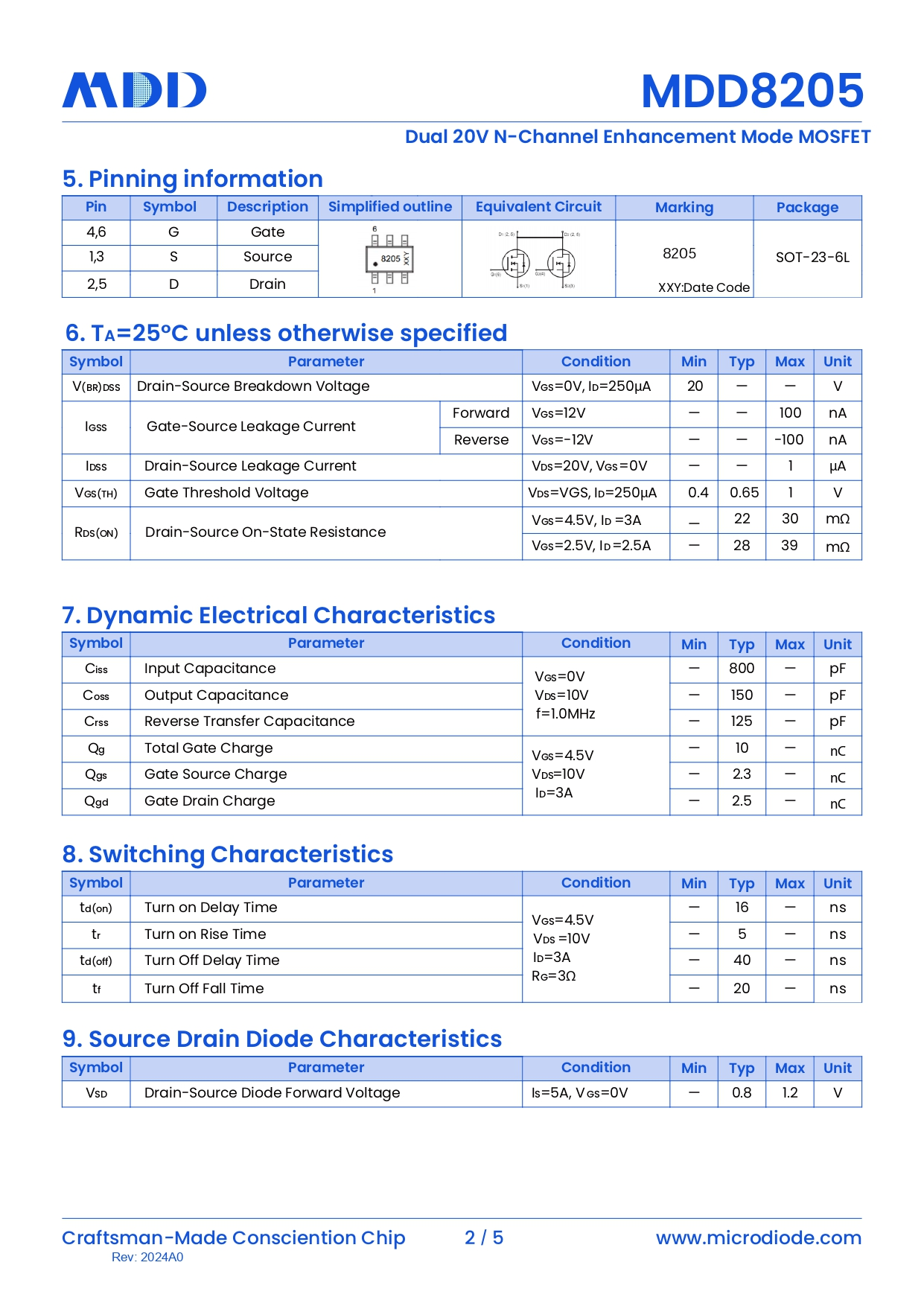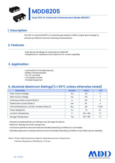 MDD8205是一款20V双 N沟道MOS,采用SOT-23-6L封装,在20V耐压下实现极低导通电阻(RDS(on))与超快开关速度。其专为严苛负载场景优化,兼顾高电流承载与微型封装,成为高效率、高可靠性设计的理想选择。