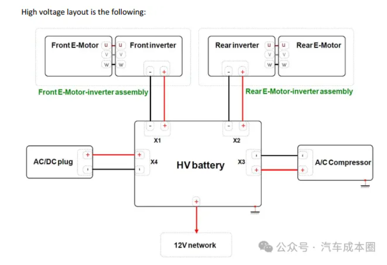 首先我们从三电系统开始。如下是其高压部件。包括高压线束,电池包(本次分析的电池包为刀片电池60.3kwh),前感应电机(137KW),后永磁电机194KW)。前后逆变器(SiC),充电模块(8KW),充电口。