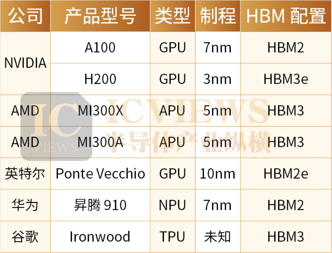 以下为部分采用 HBM 配置的主流 AI 芯片概况: