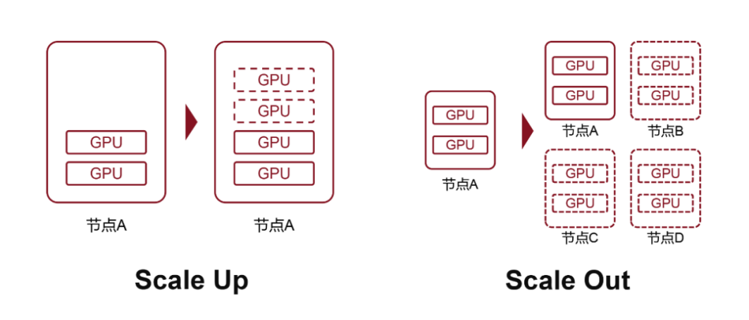 Scale Up,向上扩展,也叫做纵向扩展,增加的是单节点的资源数量。Scale Out,向外扩展,也就是横向扩展,增加节点的数量。简单理解,每台服务器里面多塞几块GPU,这时一台服务器就是一个节点。在通过网络,将多台节点连接起来,就是Scale Out。