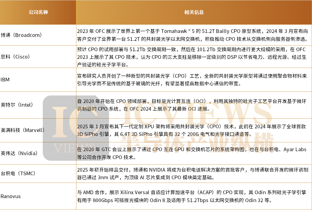 在 CPO 技术的研发和应用方面,众多行业巨头积极布局,发挥着引领作用。