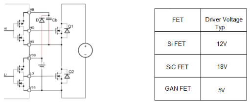 半桥功率级常因高边和低边驱动器之间的非对称开关而面临挑战。图1展示了传统的自举电路驱动方式,该电路在低边导通期间通过一个二极管给电容器(Cb)充电,从而为高边驱动器提供电源。然而,Cb需要足够的充电时间才能达到场效应晶体管(FET)的驱动电压。表格显示了不同FET所需的驱动电压。