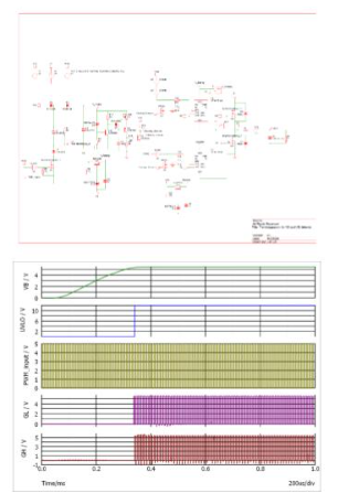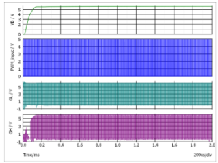 图4显示了仿真电路和详细波形。VB用作高边驱动器的电源,设计用于驱动栅极电压为5 V的GaN晶体管。UVLO配置为在4.5 V时触发,具有0.5 V的滞后范围。GL和GH分别代表高边和低边推挽驱动器的输出,在驱动晶体管的正确电压水平下实现对称开关。