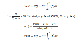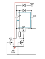 如红线所示,当Q2导通时,电容器(CP)由VDD充电并储存能量。随后,Q2关闭,Q1导通,CP放电并将其储存的能量转移到CB。CP和CB上的电压可以通过方程进行检测。