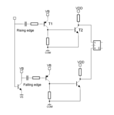 控制信号的电平移位器任务是将电平参考点从浮动点VS转换到系统参考点COM。由于VB相对于COM参考点是比较高的电压,为了减少晶体管的功率损耗,设计的电平移位器让晶体管仅在控制信号的上升沿或下降沿期间导通,其余时间保持关闭。因此,控制信号的上升沿和下降沿转换为两个短脉冲,这两个短脉冲作为置位和复位信号去控制RS触发器,触发器输出再现原始控制信号的电平状态。