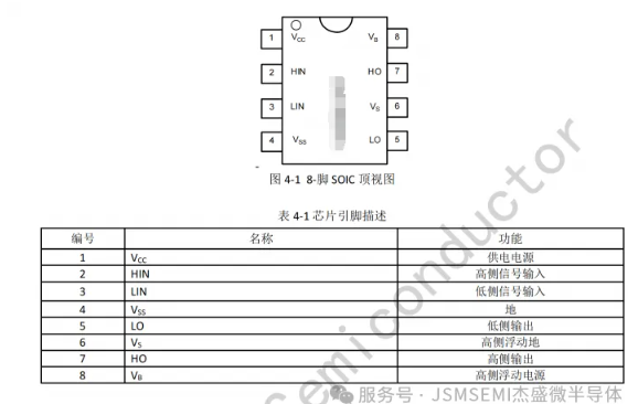 JSM5109B是一款高压、高速功率 MOSFET 高低侧驱动芯片。具有独立的高侧和低侧参考输出通道。JSM5109B逻辑输入电平兼容低至 3.3V的 CMOS或 LSTTL 逻辑输出电平,输出具有大电流脉冲能力和防直通的死区逻辑。