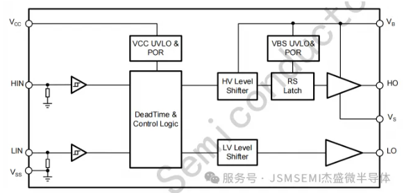 JSM5109B其浮动通道可用于驱动高压侧 N 沟道功率 MOSFET,浮地通道最高工作电压可达 250V,该浮动通道需要额外的自举电路支持。另外,JSM5109B的高侧与低侧均包含有欠压保护功能。JSM5109B采用SOP-8封装,可以在-40℃至125℃温度范围内工作