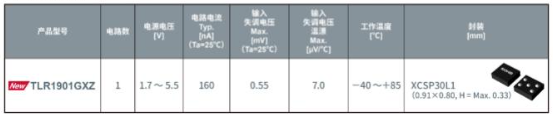新产品通过采用引脚间距缩小至0.35mm的WLCSP*1封装,实现1mm²以下的超小尺寸,同时兼具超低静态电流特性,工作时的电路电流可控制在业界超低的160nA(Typ.)。由此,该新产品不仅能在有限的空间内实现高密度安装,还能大大延长电池寿命和应用产品的续航时间。