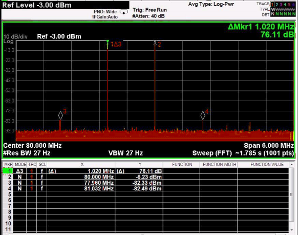 图2:三阶双音互调测试结果(中频输出79MHz/80MHz,转换率400MSPS)