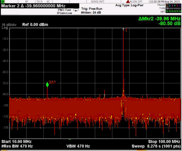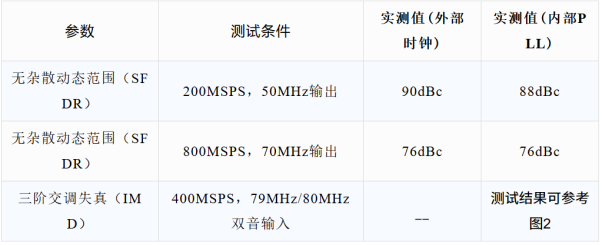 图1:无杂散动态范围测试结果(中频输出70MHz,转换率800MSPS)