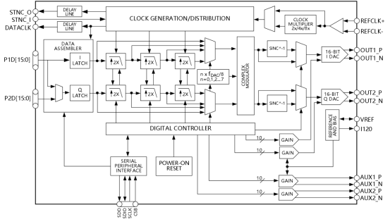 -数字滤波器单元:负责2×/4×/8×插值与数字调制,支持复数调制器将载波灵活放置在DAC带宽内;