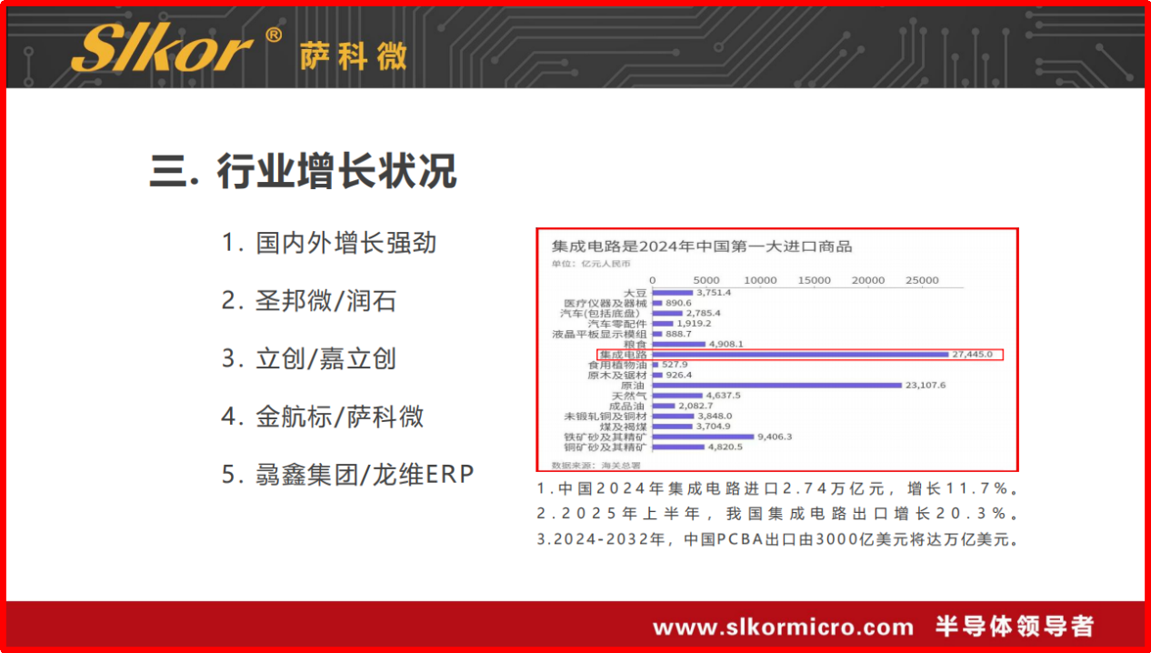 我们来看三个数据,就知道电子半导体行业大有可为。一是中国2024年集成电路进口2.74万亿元,比2023年增长11.7%,仍旧是第一大进口商品。举个例子,我出生的时候唯一家用电器是手电筒,到我读初三的时候,家里有了第二个电器是电灯,当时能装个18瓦的老式日光灯管就算很好了,前几天刚买了一台智能扫地机器人,所以我们这个集成电路行业还有得搞。第二个数据是2025年上半年,我国集成电路出口增长20.3%,增长的喜人。现在大量中企都在出海、往外卷,我们金航标kinghelm和萨科微slkor在努力出海,在海外打广告已经花了1000多万元人民币了。还有第三点,2024-2032年,中国PCBA出口由3000亿美元将达万亿美元,这个是我们集成电路的强关联性的配套数据。这些都充分印证了我的第一个观点——“国内外增长强劲”。
