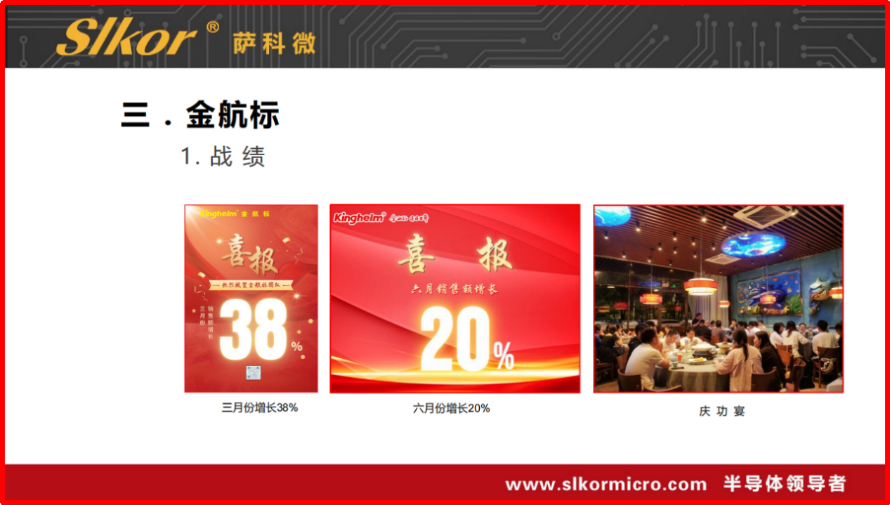 看上图,金航标今年3月份是环比增长了38%,淡季仍旺源于长期积累和持续努力,6月份增长了20%。图三是庆功宴,我们公司比较装逼,庆功宴都喝五粮液。“萨科微”也在增长,请看我们的数据支撑: