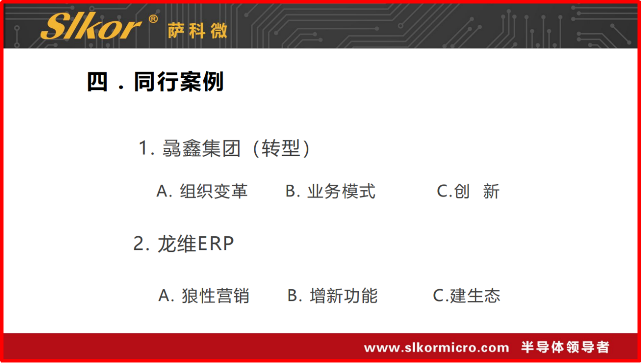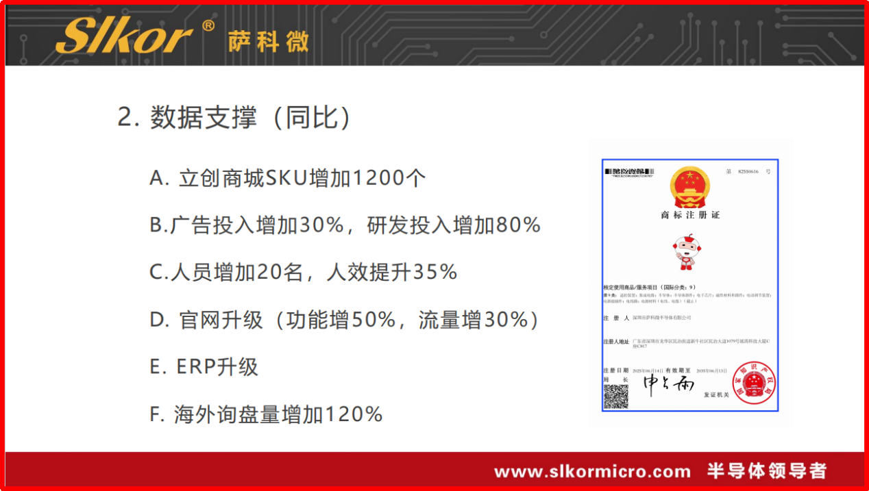 我宋仕强认为,我们做企业还是要讲良性循环、良性增长,比如我们在立创商城的SKU增加了1200个,这是健康标签SKU总量1200+,我们原来是有6000多个,这个同比增长达到20%左右,所以拉动公司增长是肯定的。广告投入增加了30%,研发投入增加了80%,员工增加了20名,人效提高了35%,这些数据都是我们自己统计、比较科学的。还有我们官网升级(各种功能增加了50%,流量增加了30%),加上我们金航标和萨科微是靠段子营销的,段子写得好的同时,又把产品做好了,所以有资格在这里谈增长。