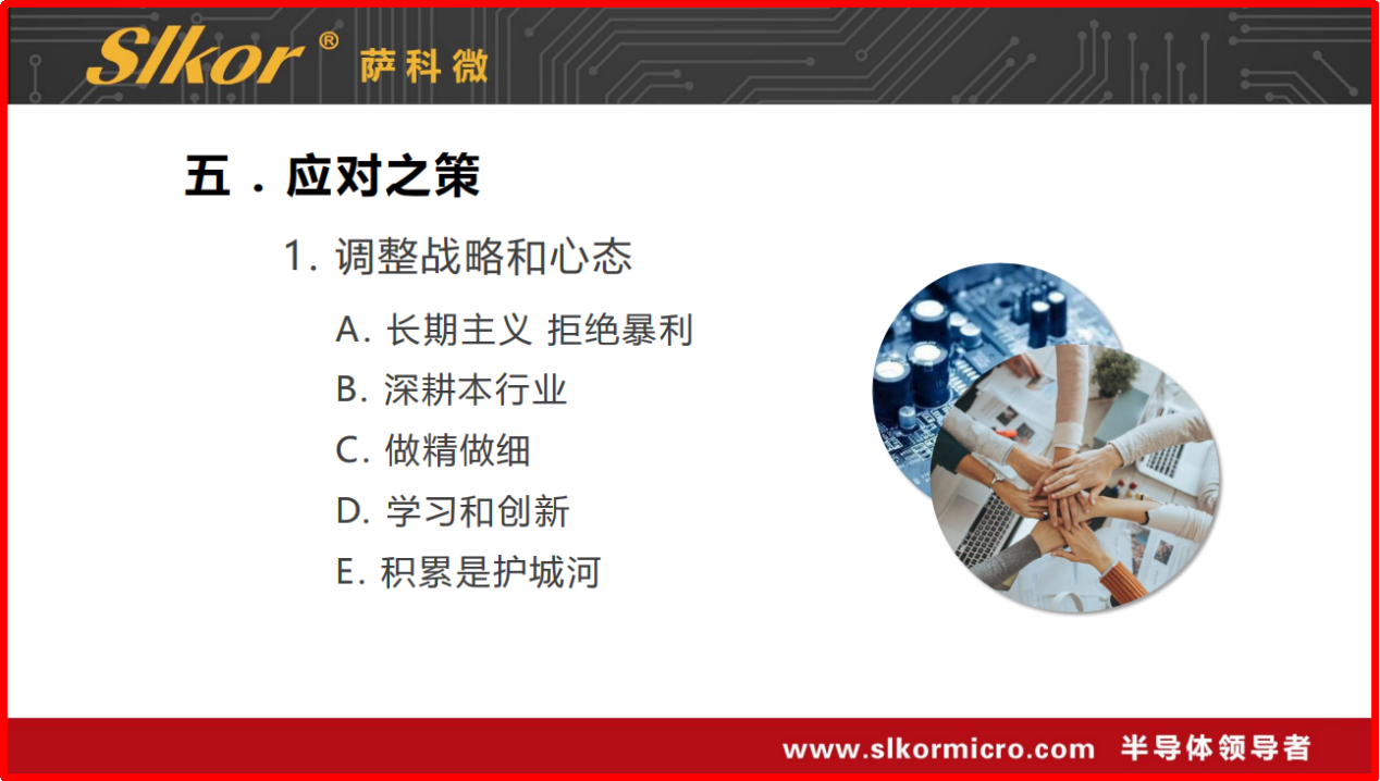 合适的应对之策是重中之重,调整战略和心态是首要的。一是做长期主义,拒绝暴利。“暴利”收割行业的时代结束了,且暴利会让人狂妄自大失去正常心态,华强北几位开劳斯莱斯的兄弟都黯然离场了,所以还是踏实稳定干比较好。二是深耕本行业,现在还稳步发展的企业都是行业沉淀好多年的,他们坚守公司战略,不想着一夜暴富赚快钱。三是做精做细,微利时代,企业就是要向管理要效益,必须做好精细化管理,抠细节控制好成本,企业才能有点钱赚。四是学习和创新。我们金航标Kinghelm和萨科微Slkor公司打造学习型组织,培养学习型员工,提高人效,推动企业管理微创新大发展。企业在原有的基础上做一些微创新、微调整,利用互联网思维去做,就能够做好,换言之就是微创新+互联网营销是可以行得通的。五是积累是护城河。我华强北宋仕强认为,企业成功的秘诀和底层的逻辑是重在积累、久久为功,比如我们金航标和萨科微的高速稳健增长正是践行多年的“工作好是为了生活好”的以人为本的理念,及构建的管理体系和组织行为机制,同时确保公司知识工程、组织架构、质量管理体系、工作流程、激励机制,从产品研发到现金回笼的高效商业闭环实现效率高高、分钱多多。