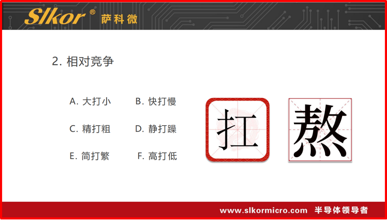 相对竞争,简单点说就是竞争是相对的,你只要比其他竞争对手强一点就行了,我归纳出了六个要点,分别是大打小、快打慢、精打粗、静打躁、简打繁、高打低,可以理解为:商业竞争中一直都是大鱼吃小鱼、快鱼吃慢鱼,企业走向精细化管理,就要放弃粗放式管理,静才能成大事,简单才能持久,高效更是王道,对于行业和产品有高维度认知的,会超过只有粗浅认知的竞争者。我们金航标和萨科微致力于打造简单和谐、高效进取的工作氛围,希望员工们上班努力工作、下班开心生活,这样利于员工们的身心健康和长远发展。
