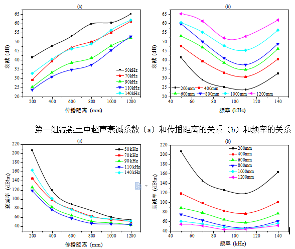 图:混凝土中超声衰减率系数(a)和传播距离的关系(b)和频率的关系