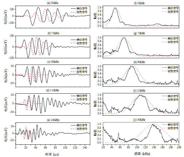图:混凝土中两个面对面换能器测得的脉冲响应(a)~(e)为时域信号,(f)~(j)为频域信号