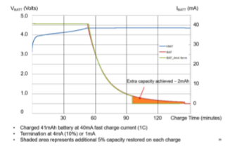 图 2 还重点说明了不准确的 ITERM 监测如何导致在 4mA(而非 1mA)终止,这意味着用户将损失 5% 的可用 41mAhr 电池容量。由于电源路径充电器单独调节充电电流和系统电流,因此系统电流的任何变化都不会影响充电电流。因此,充电终止可以在一个稳定的预定值上发生,从而最大程度地提高电池的荷电状态。