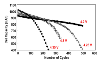 图 3. 锂离子电池容量与充电循环数量之间的关系。