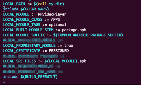 其次,将已经调试完成后的业务APP放入到上述创建好的目录下,并且新建Android.mk编译文件,请注意:务必保证Android.mk编译文件与业务APP在同一级目录,否则编译时会因为路径问题编译不通过。其中最重要的是Android.mk的编写,以下图所示为例,简单描述一下各个属性的意义: