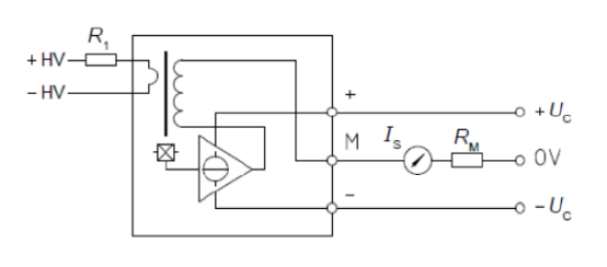 在被测量电压两端串联电阻R,形成非常小的原边电流Ip,原边电流Ip和原边线圈产生原边磁场,这个原边磁场和输出电流Is在补偿线圈上产生的磁场大小相等,方向相反,霍尔感应器件和处理电路与补偿线圈一起输出电流Is,该输出电流Is精确反映被测电流Ip的大小和方向,进而精确反映被测电压Vp的大小和方向。不同种类的电压传感器原边电阻R,有的集成在传感器中,有的需要客户使用时外接。