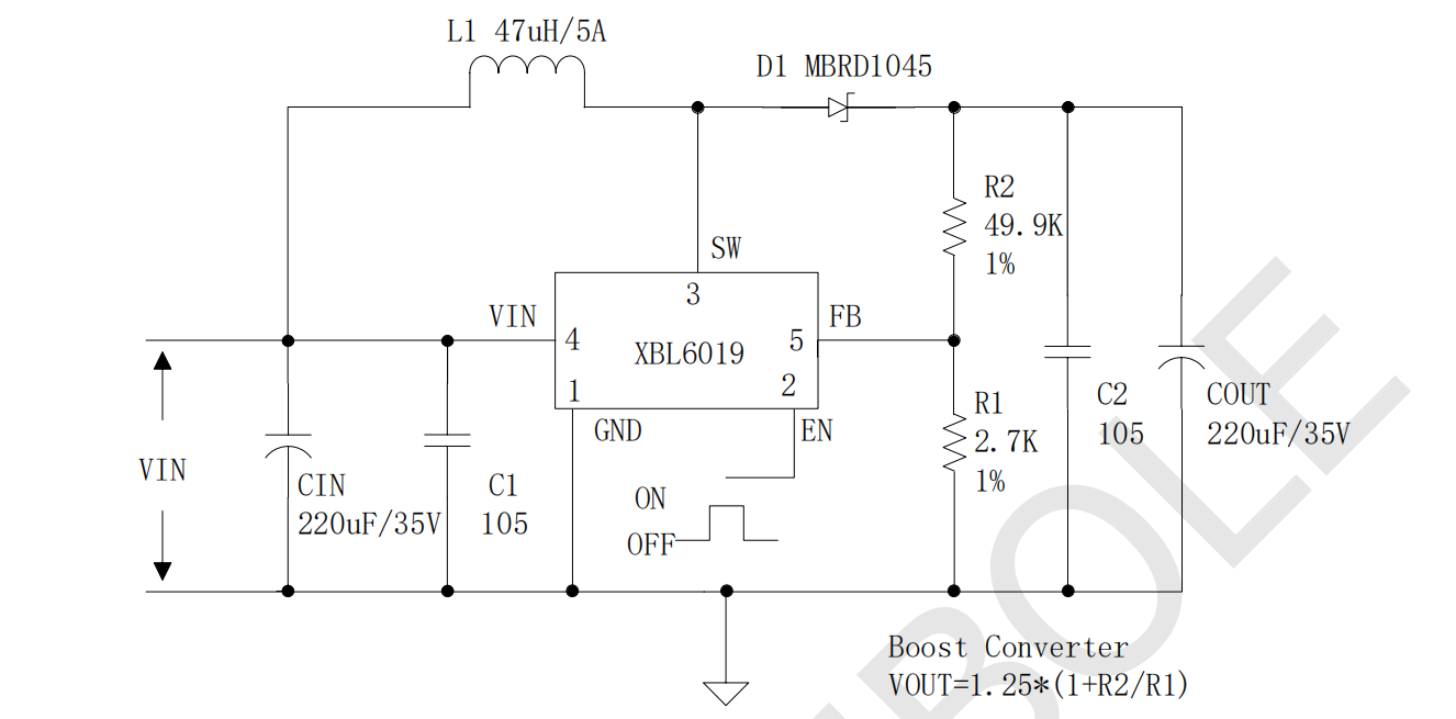 上图为芯伯乐XBL6019 Boost升压转换典型电路,输入电容CIN和C1用于平滑输入电压,XBL6019通过开关引脚 SW 控制电感L1,实现升压功能,续流二极管D1为电感释放能量时提供续流路径,反馈电阻 R1 和 R2 构成分压网络设定输出电压,输出电容C2和COUT则用于平滑输出电压,降低纹波,确保为负载提供稳定电源。
