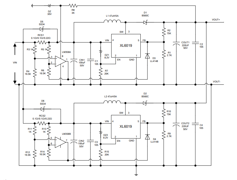 此电路图为双路Boost升压转换器电路采用XBL6019 芯片并联方案,通过控制输入电流限制每路输出功率,能够实现输入24V、输出100W的功率需求,并具有优秀的线性调整率与负载调整率。电路中需将每路输入电流控制在2.5A以内,同时为保证XBLW LM358运放的正常工作,其最高供电电压控制在32V以内,且运放同相端与反相端的输入电压比供电电压小3V以上。此外,为防止上电瞬间冲击电流损坏采样电阻,需在在采样电阻两端并联肖特基二极管。