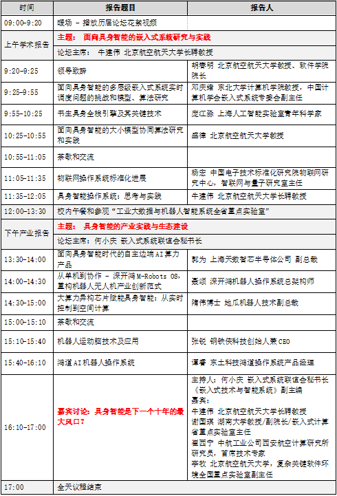 具身智能是人工智能与物理世界交互融合的全新范式,其中嵌入物理世界的计算系统是交互融合重要桥梁。如何为具身智能系统构建一个创新的嵌入式计算系统,如何打造高算力异构多核计算平台、操作系统及其软件栈和创新的应用生态是嵌入式系统产业界面临的挑战。国产嵌入式操作系统技术与产业发展论坛长期致力推动中国嵌入式系统和嵌入式操作系统产业的发展,抓住产业、开源、基础三大要点,推动中国嵌入式操作系统核心技术和落地应用。 国产嵌入式操作系统技术与产业发展论坛暨嵌入式系统联谊会主题讨论会走过六年的发展历程,以高校为基地、企业为支撑、应用为牵引,举办了工业、汽车、RISC-V和人工智能等热点应用研讨,也深入讨论了混合关键系统和物联网操作系统等关键技术问题。 经过近多年的努力,已经基本确立了国产嵌入式操作系统技术与产业发展论坛作为我国嵌入式系统学术和产业界技术交流和生态发展的主流平台地位。
