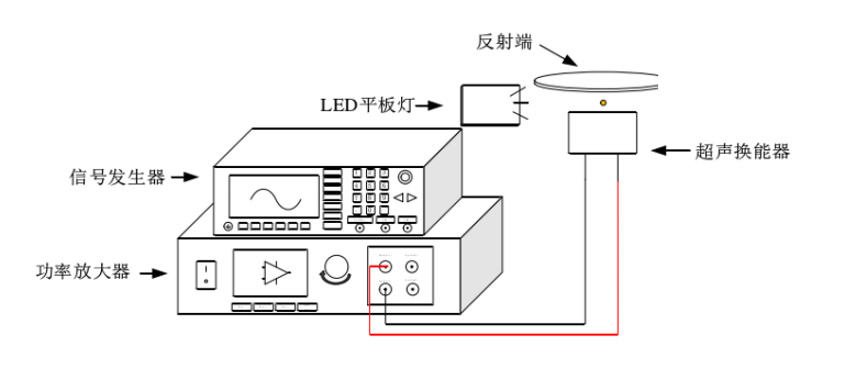 超声驻波悬浮试验系统主要由信号发生器、功率放大器、超声波换能器、机械固定支撑装置、超声换能器等组成。