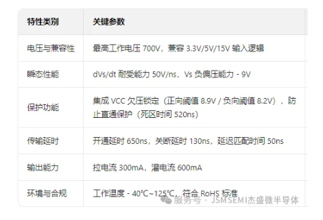 - 智能保护机制:集成 VCC 欠压锁定(UVLO)、防止直通保护(死区时间 520ns),从源头避免功率器件损坏。
