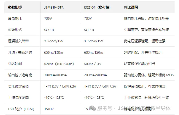 作为 EG2104 的替代型号,JSM2104STR 在关键参数上高度兼容,同时部分性能更优。以下是两者核心参数对比表:
