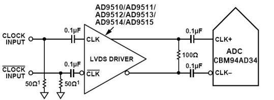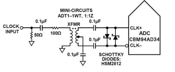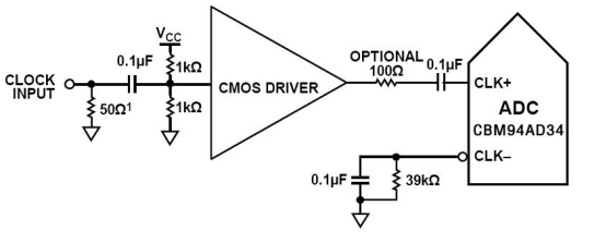 为充分发挥芯片性能,CBM94AD34的采样时钟输入端(CLK+和CLK-)需采用差分信号,推荐以下时钟输入电路: