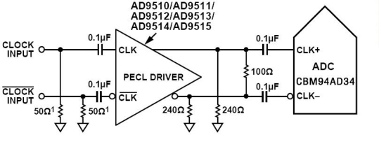 若没有低抖动时钟源,可对差分PECL信号进行交流耦合传输至采样时钟输入引脚,AD9510/AD9511/AD9512/AD9513/AD9514/AD9515系列时钟驱动器具有出色抖动性能,电路如图7所示。