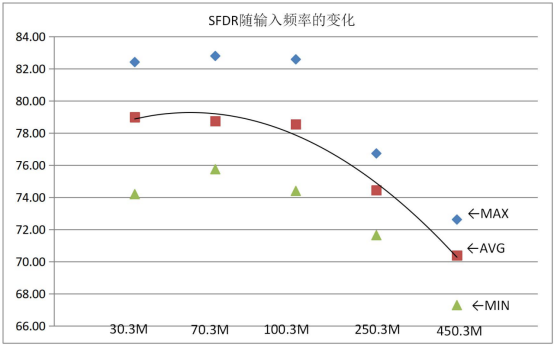SFDR随输入频率的变化曲线表明,在各种输入频率条件下,无杂散动态范围均展现出卓越的性能,充分满足宽带应用的各种需求。