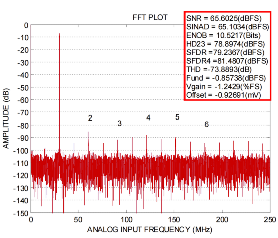 当采样率fCLK=499.99970304MHz、输入信号频率fIN=30.28867830MHz时,测试结果为:SFDR=79.23dBFS,二阶和三阶谐波失真(HD2,3nd)=78.89dBFS,四阶谐波失真(HD4nd)=81.48dBFS,SNR=65.6dBFS,SINAD=65.1034dBFS,ENOB=10.5217bits。