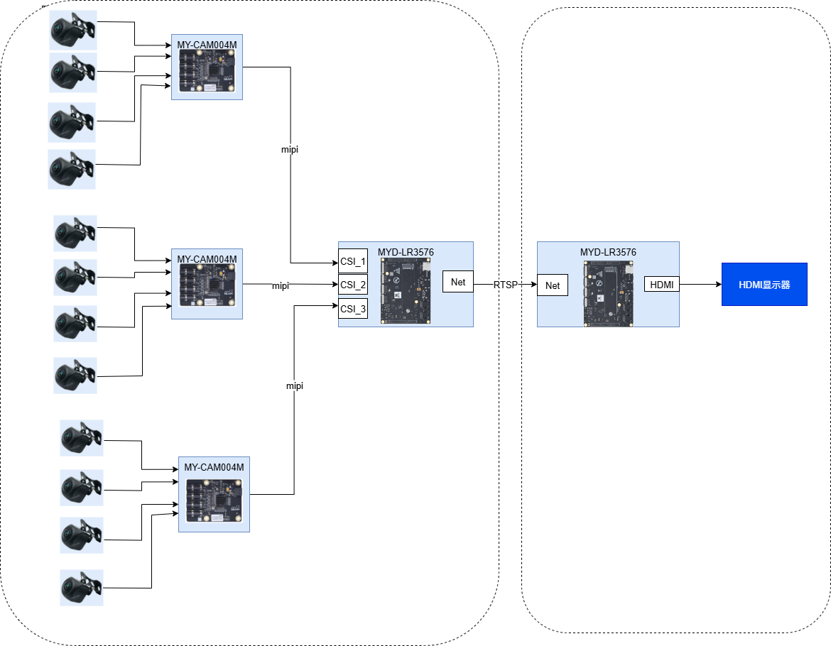MYD-LR3576开发板拥有3路4lan MIPI-CSI接口,搭配MY-CAM004M视频转换模块可以接入12路(1920*1080 30帧)AHD高清摄像头,使用RGA图片处理后再经过VPU单元模块编码成H264码流通过网络RTSP推流。此过程视频延迟在80~100ms以内。