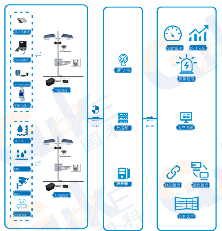 成都国科EP3000系列生态流量监测管理系统,以自动化流量和视频监控为主,以各类前端传感器如水位计、闸位计、流量计、电能表和视频等相互补充的形式进行水位、流量的信息采集,利用4G/5G无线网络或有线网络,实现监测点、监控中心和下泄流量信息中心之间的信息传输,实现流量信息采集、传输、处理,形成综合数据库。
