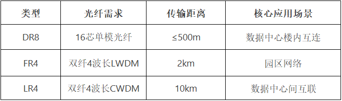 光纤选型:DR8用单模光纤(500m),LR4需G.652.D单模(10km)。
