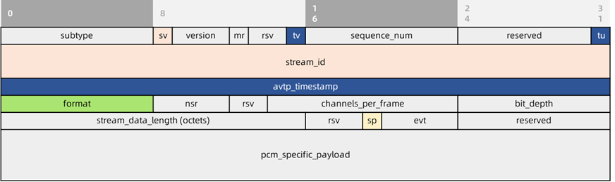 可以看到头部中包含丰富的音频数据的元数据信息,而负载部分是以类似字节流的形式记录音频数据。下文将对AVTP支持的音频格式分别进行讲述。