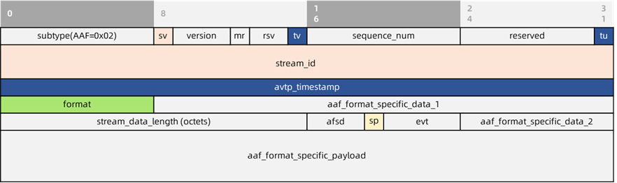 用来传输音频的AAF为了保证在多接收端场景下的同步及稳定连续的播放效果,需要在头部携带音频数据的时间戳信息,因此使用通用流头部格式。除此之外,AAF的头部中还携带了采样率、采样深度和采样格式信息,用来告知接收端(listener)音频信息的格式。AAF报文格式如下图所示: