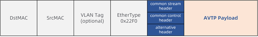 整个AVTPDU可以分为三个部分:以太网数据链路层头部、AVTP头部和AVTP负载,如图所示: