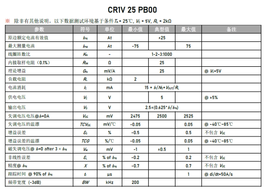 所有型号(CR1V 6/15/25 PB00)的测量范围均为 ±值(如 ±6A, ±15A, ±25A)。