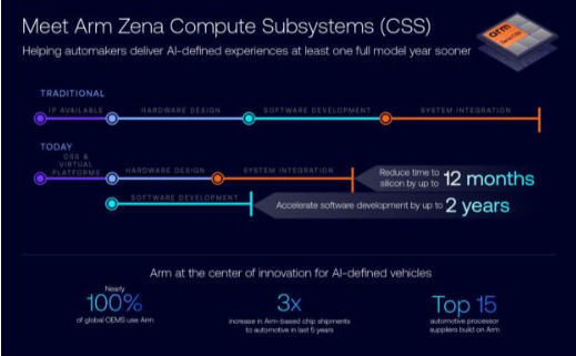 如何更快地将创新成果带给驾驶者,是当下车厂面临的重大挑战之一。传统的芯片开发周期往往会导致车辆交付延迟,使车厂无法提供当今驾驶者所期待的、由人工智能 (AI) 驱动的功能。Arm Zena CSS 能够缩短产品上市周期,在不同车型系列中实现 AI 能力的扩展,并助力车厂在快速演进的 AI 定义汽车时代保持竞争力。