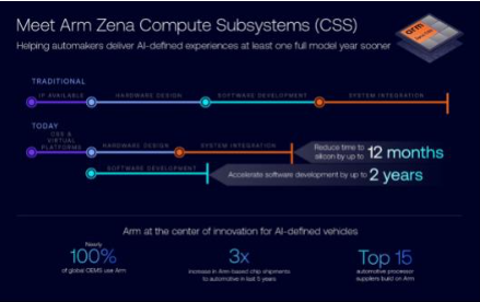 几乎全球所有的整车厂都得益于 Arm 的基础技术。有鉴于此项优势,Arm 推出了专为新一代汽车(即 AI 定义汽车)而打造的计算平台——Arm Zena 计算子系统 (Compute Subsystems, CSS)。