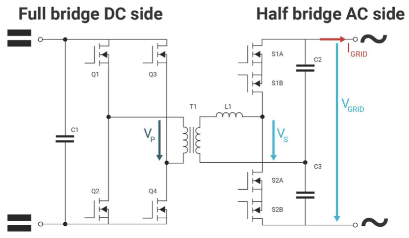 在本例中,直流侧实施全桥,在变压器 T1 的初级侧生成输入信号 VP。交流侧实施半桥配置(带电容分压器),模拟次级侧各段 VS 的交流输出 VGRID。