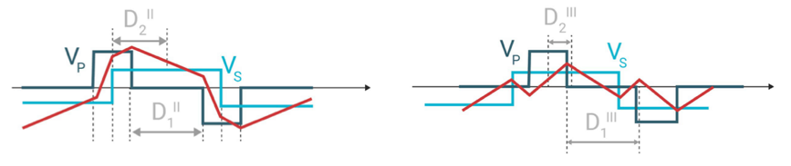 只要开关在软开关模式下运行,相移双有源电桥转换器就能有较高的效率。当次级侧电压发生变化时(例如交流侧的正弦波),很难实现这一点。TIDA-010954 中实施了两种相移控制方法。下面的 IEEE 论文中说明了控制方法。对于大功率,在交流峰值附近实施“模式 II”。对于小功率(交流斜率和交流信号的过零点),则使用“模式 III”。模式 II 和模式 III 的相移控制差异如图 3-1 所示。